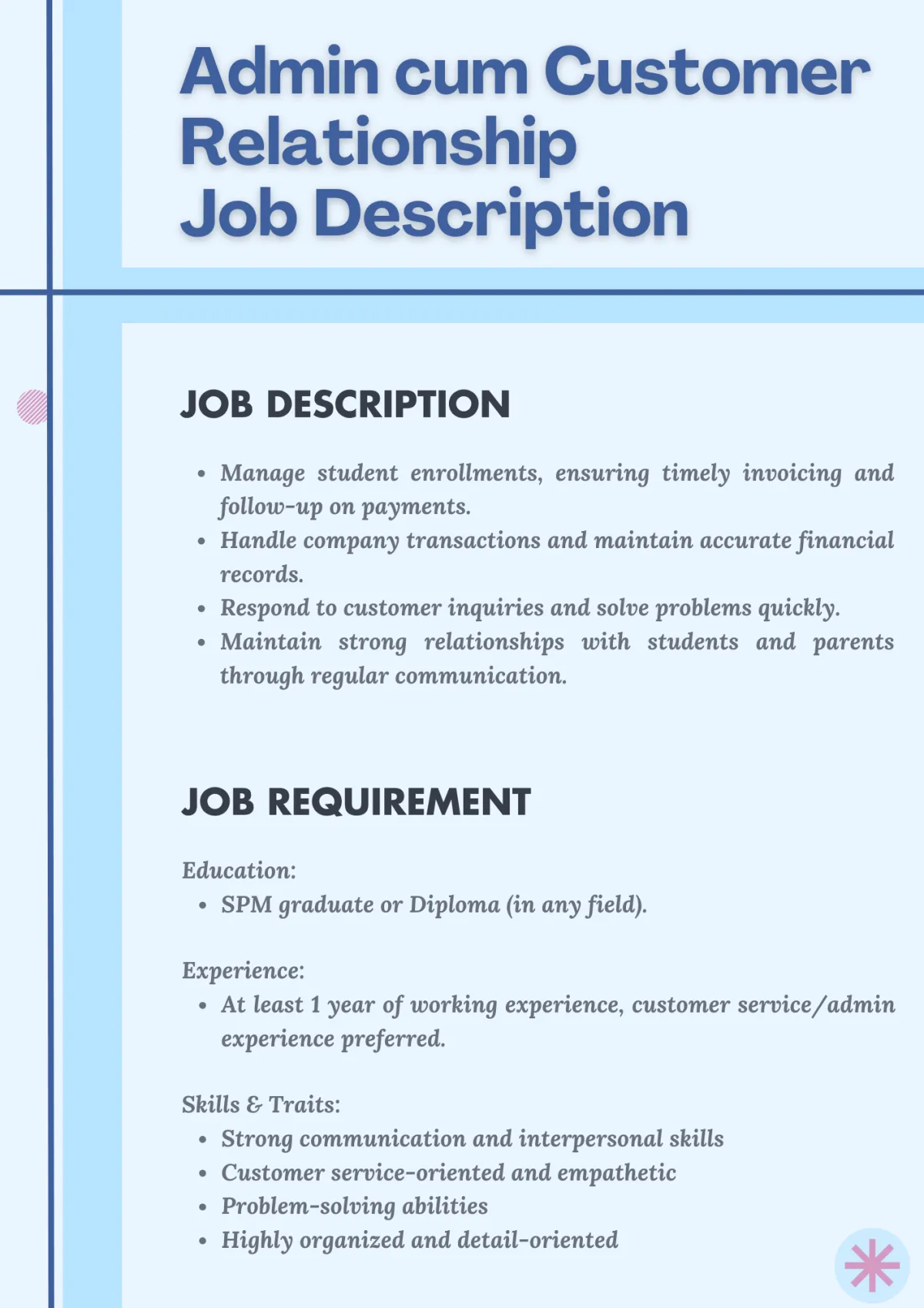 成为我们的Admin cum Customer Service!